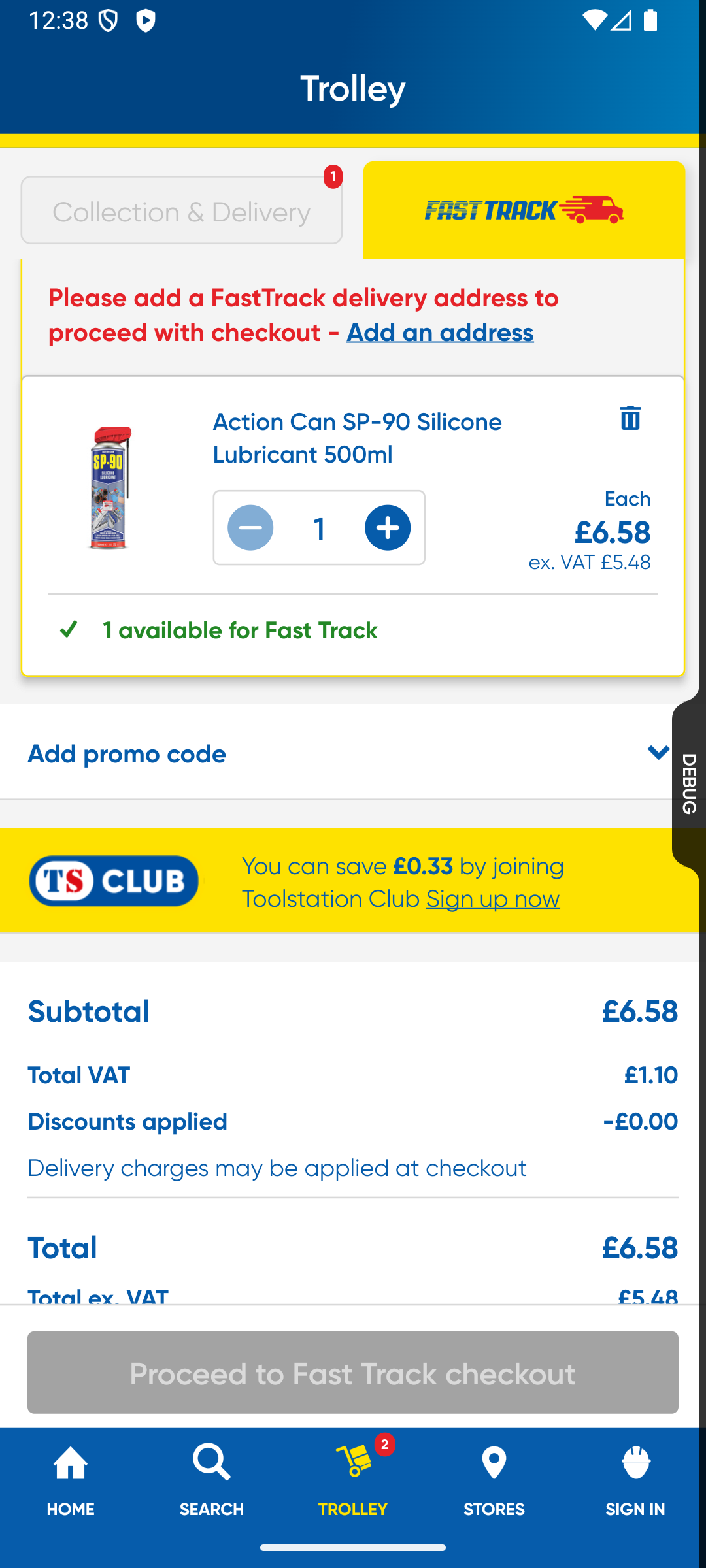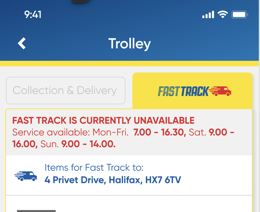 - If the address is eligible, normal trolley CTAs are replaced with Fast Track CTAs, allowing users to add products to a Fast Track trolley.